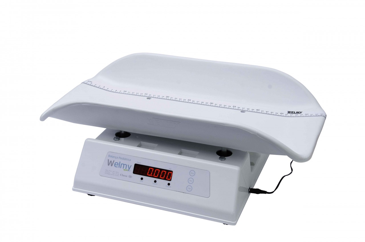 Balança Pediátrica Eletrônica 109 E Antropométrica Concha anatômica em polipropileno com medida 540 x 290 mm injetada em material anti-germes; .Faixa de medição antropométrica na concha de 54 cm; Gabinete em Plastico ABS; Display LED com 6 dígitos de 14,2 mm de altura e 8,1 mm de largura; Estrutura interna em aço carbono bicromatizado c/ cobertura plastica; Pés reguláveis em borracha sintética; Fonte externa 90 a 240 VAC c/ chaveamento automático; Função TARA até capacidade máxima da balança; Homologadas pelo INMETRO e aferidas pelo IPEM; 01 ano de garantia; Marca WELMY, fabricante WELMY, procedência nacional; Assistência técnica em todo território nacional.